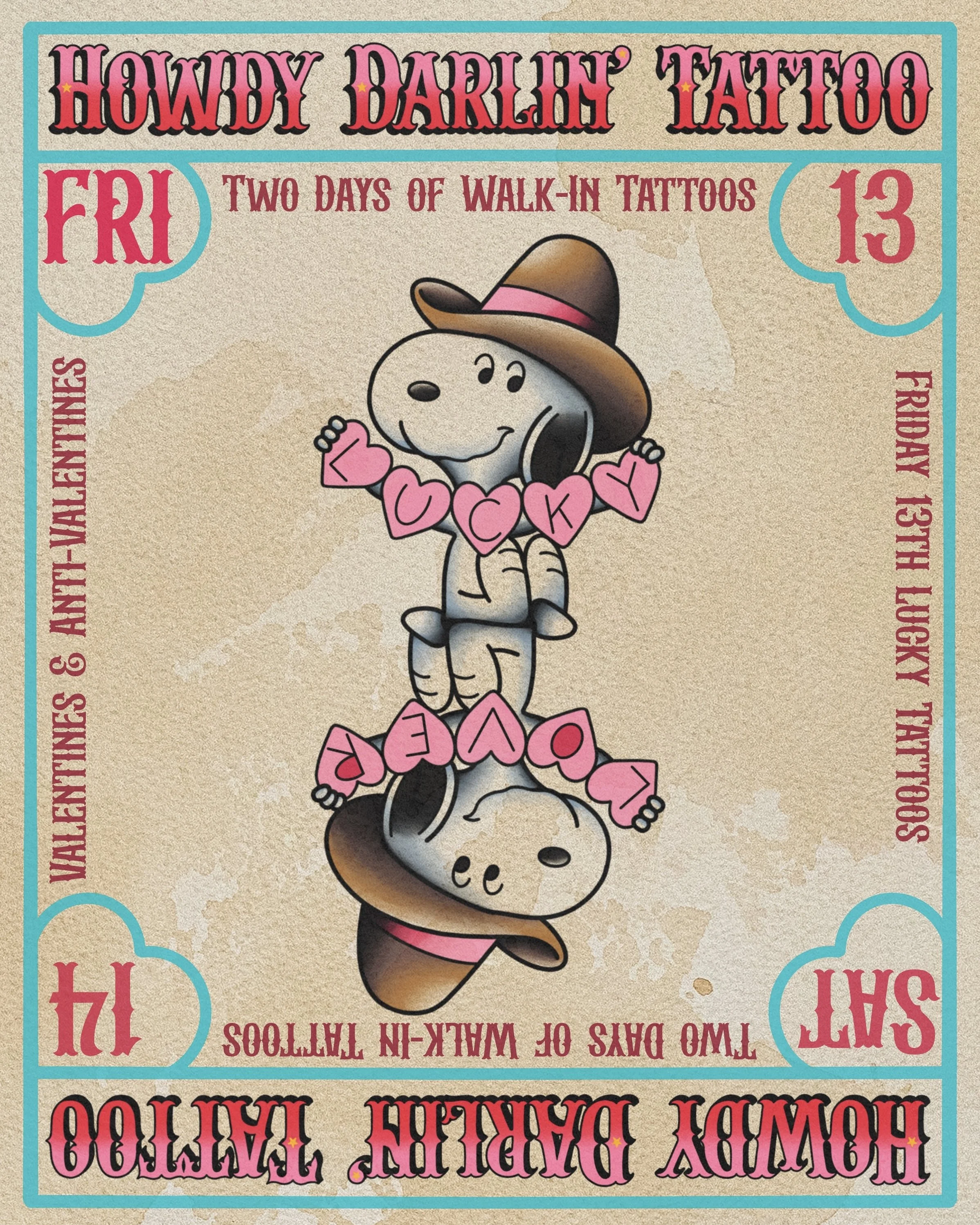 Bring some good luck and loving vibes for the year to come with our first flash day of 2026! Join us for two full days of walk-in tattoos themed around Love and Luck (with some anti-valentines sprinkled in for good measure!)