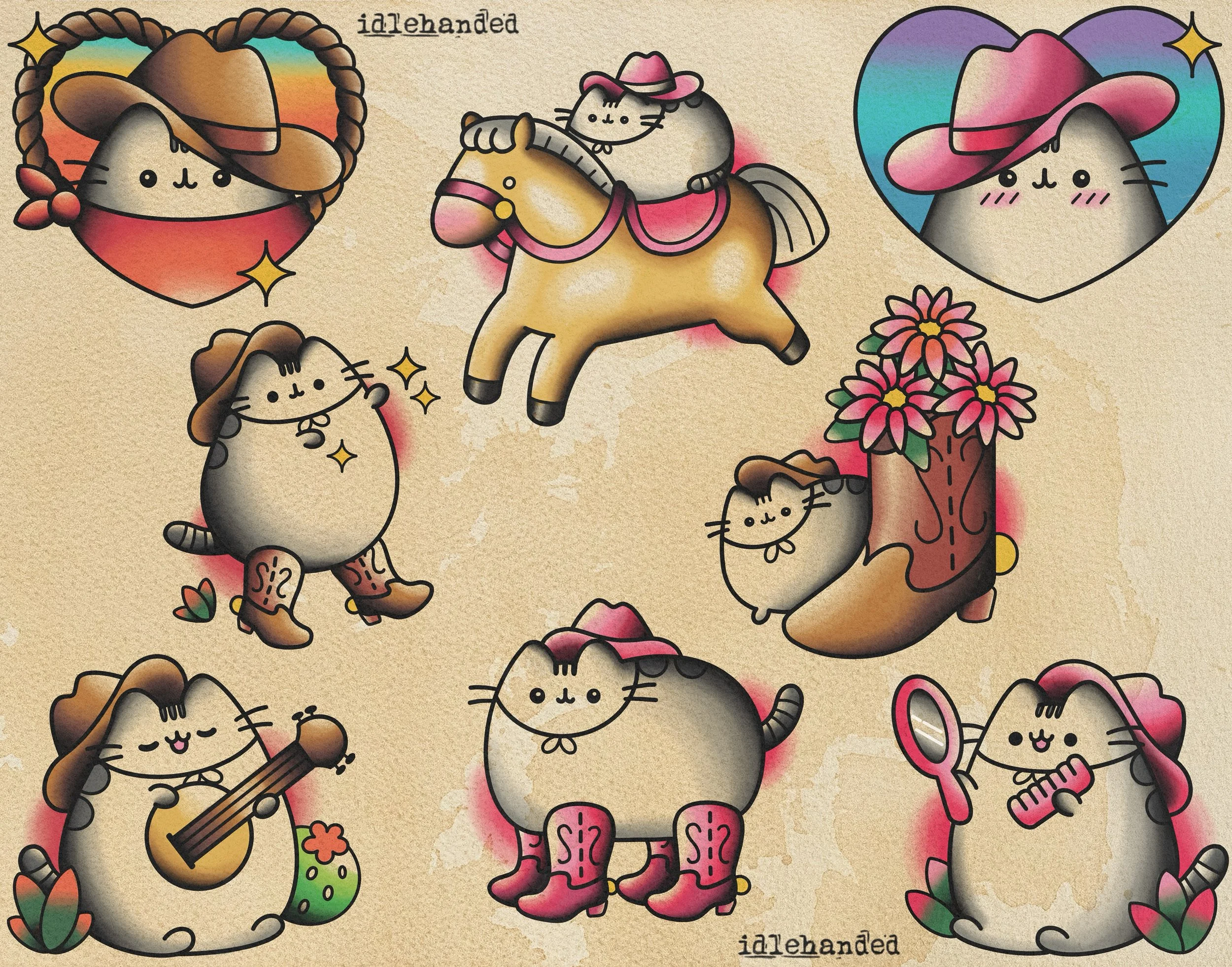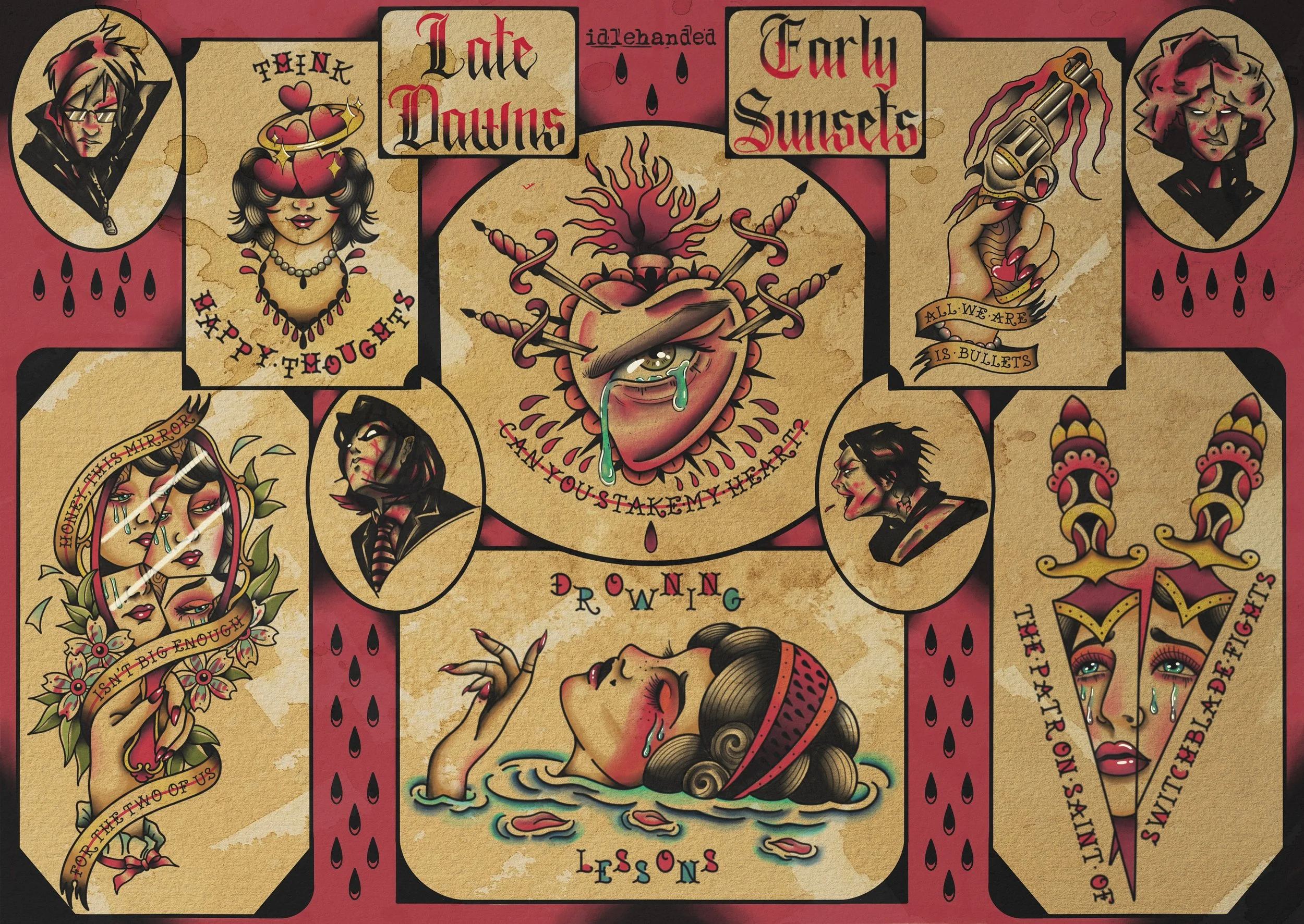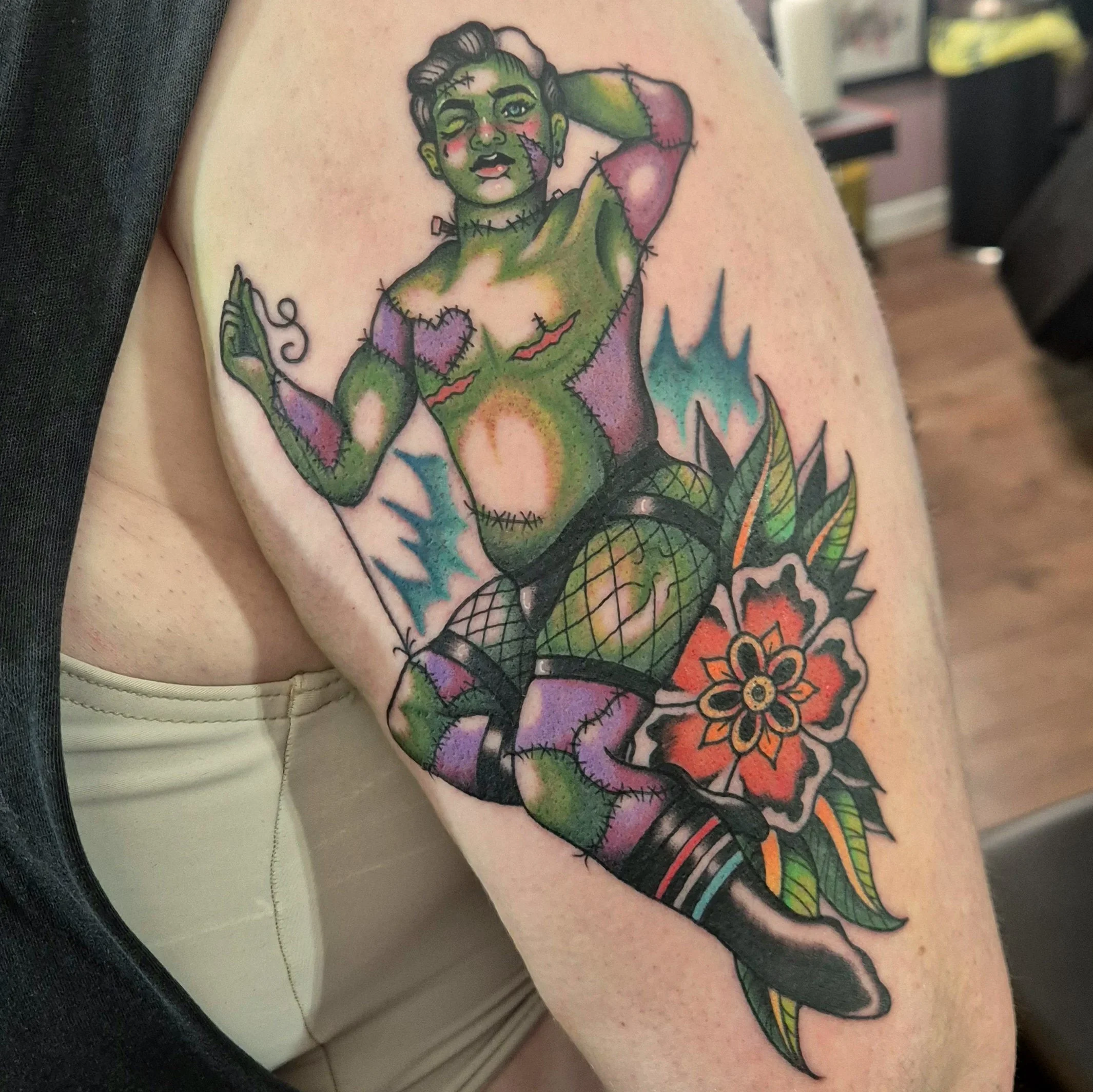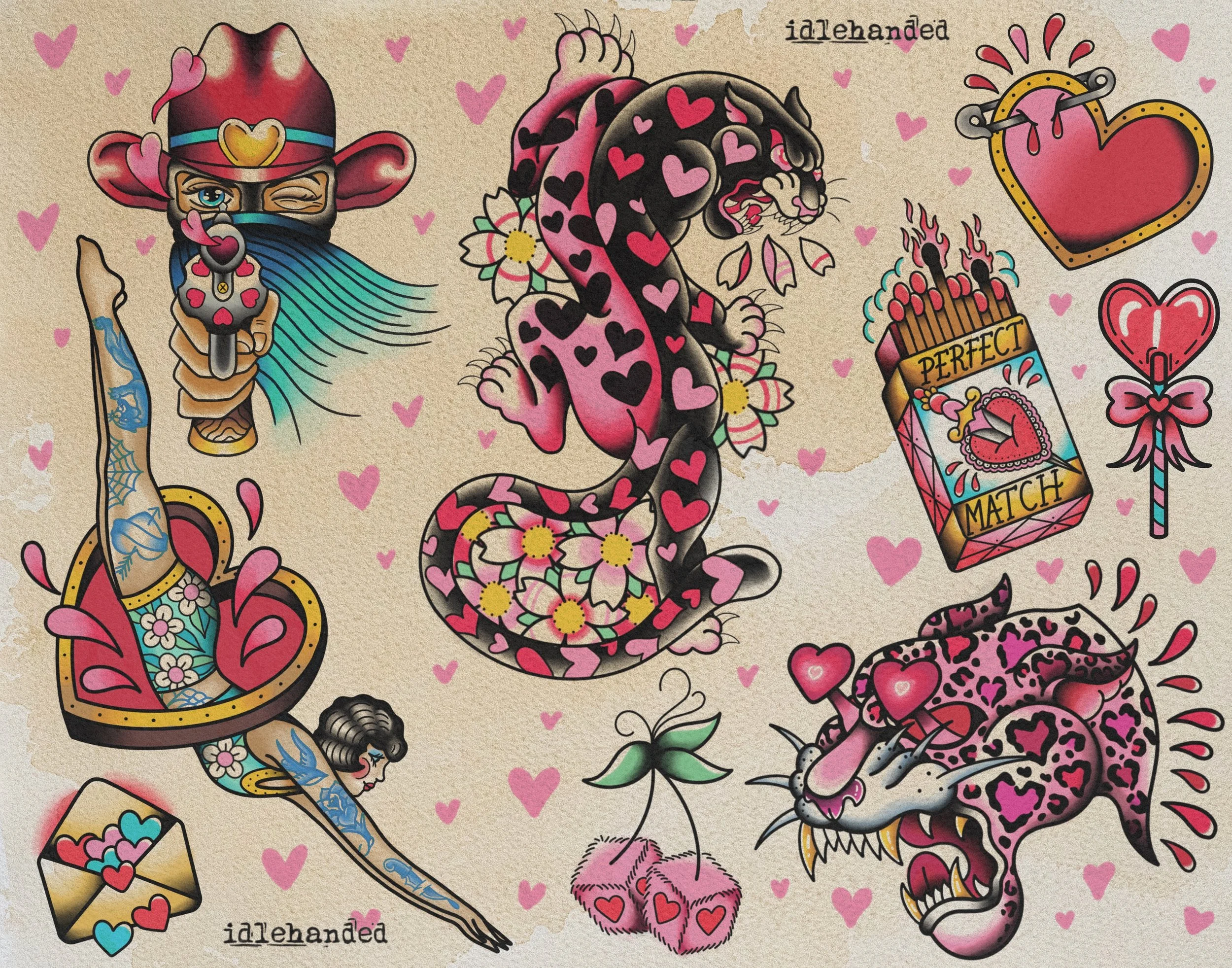My work is somewhere in between American Traditional and neo-traditional tattooing styles; essentially, I use bold lines and lots of pink. My flash is inspired by video games (get me talking about Fallout or Red Dead Redemption!), old cartoons, nostalgia, and music. I’m a 90s kid who grew up emo, and it shows!